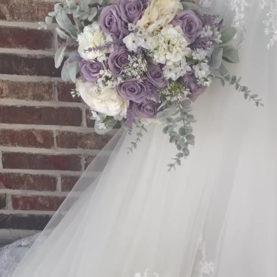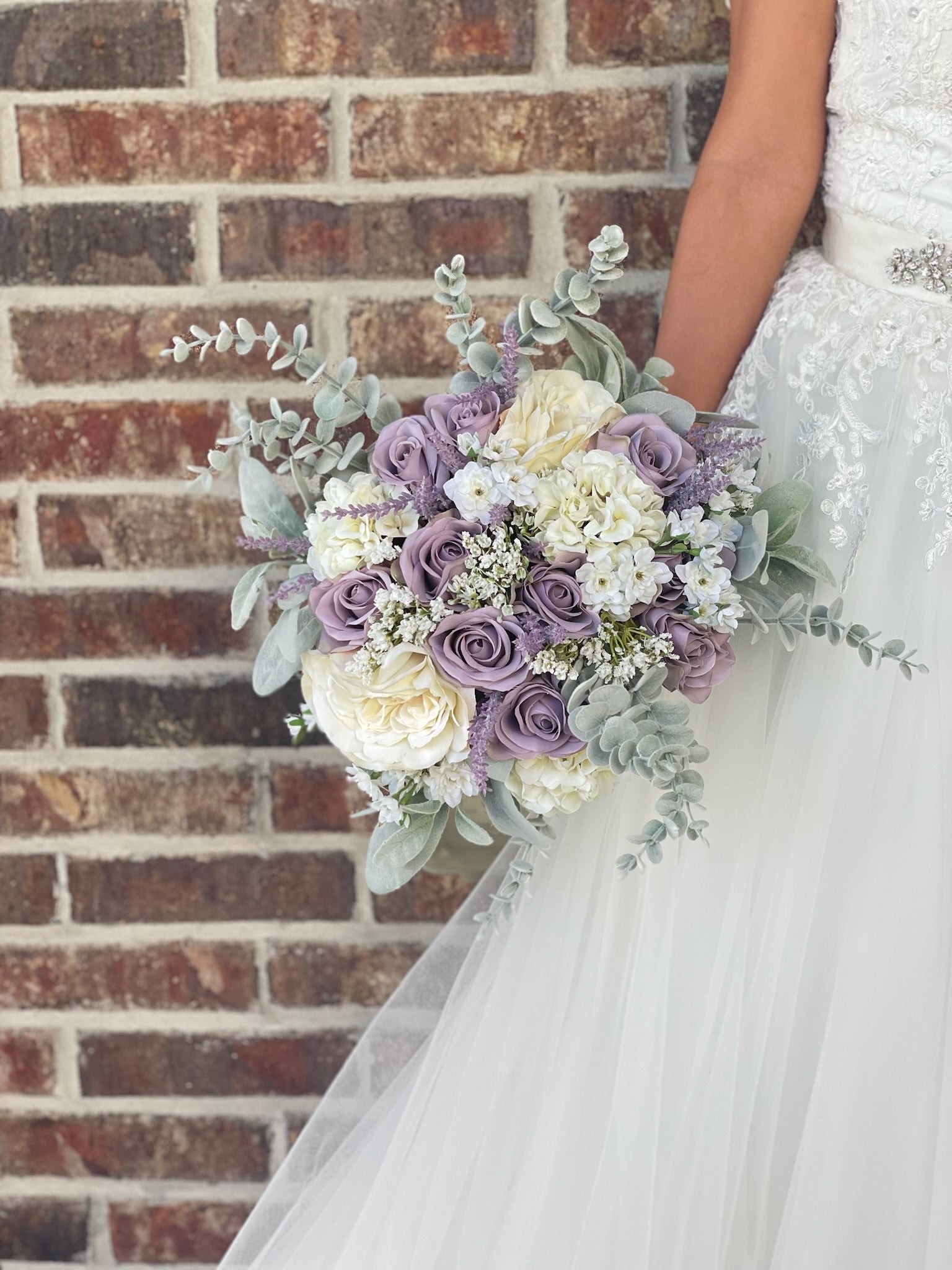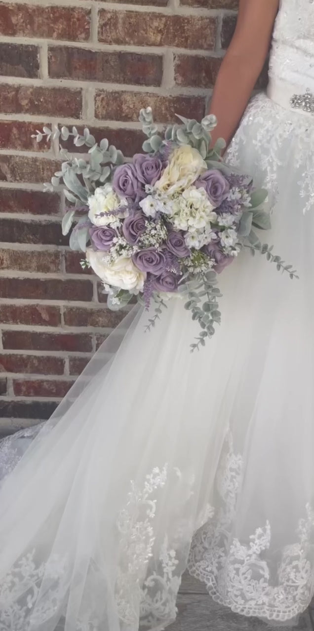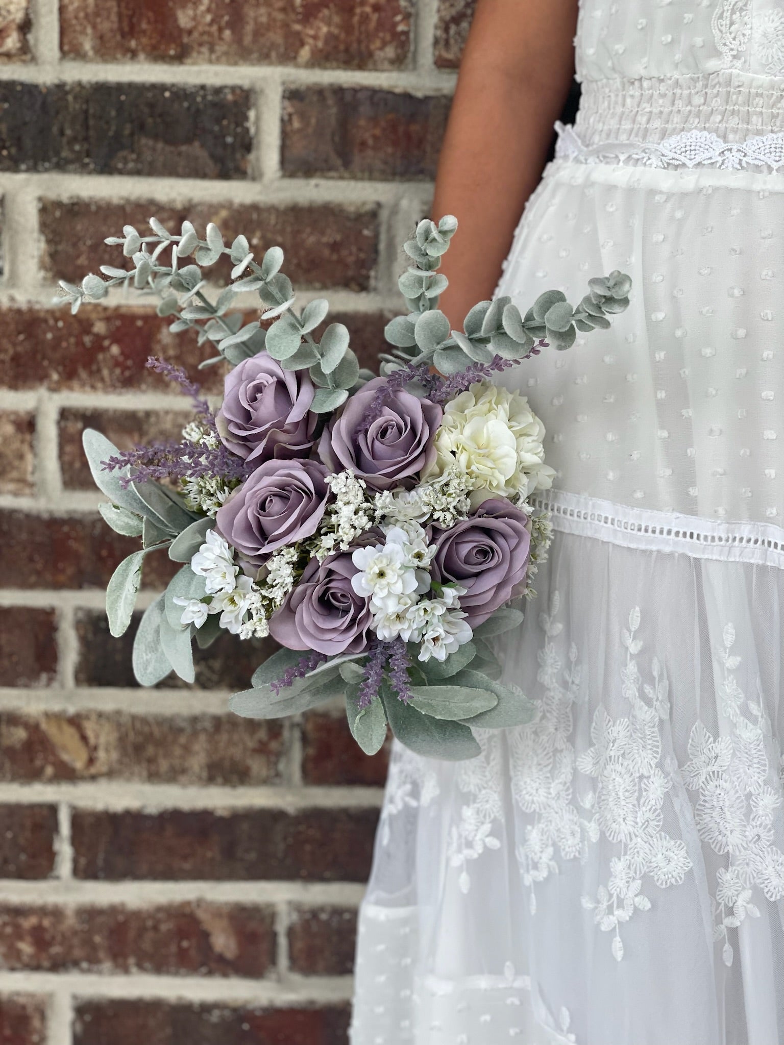 This Boho style bouquet is made with multiple greenery bushes, light purple roses, cream carnations, ivory hydrangeas and baby's breath wrapped with ivory lace. It'll stand out perfectly in your pictures and give a beautiful romantic look inspired by nature and the outdoors.